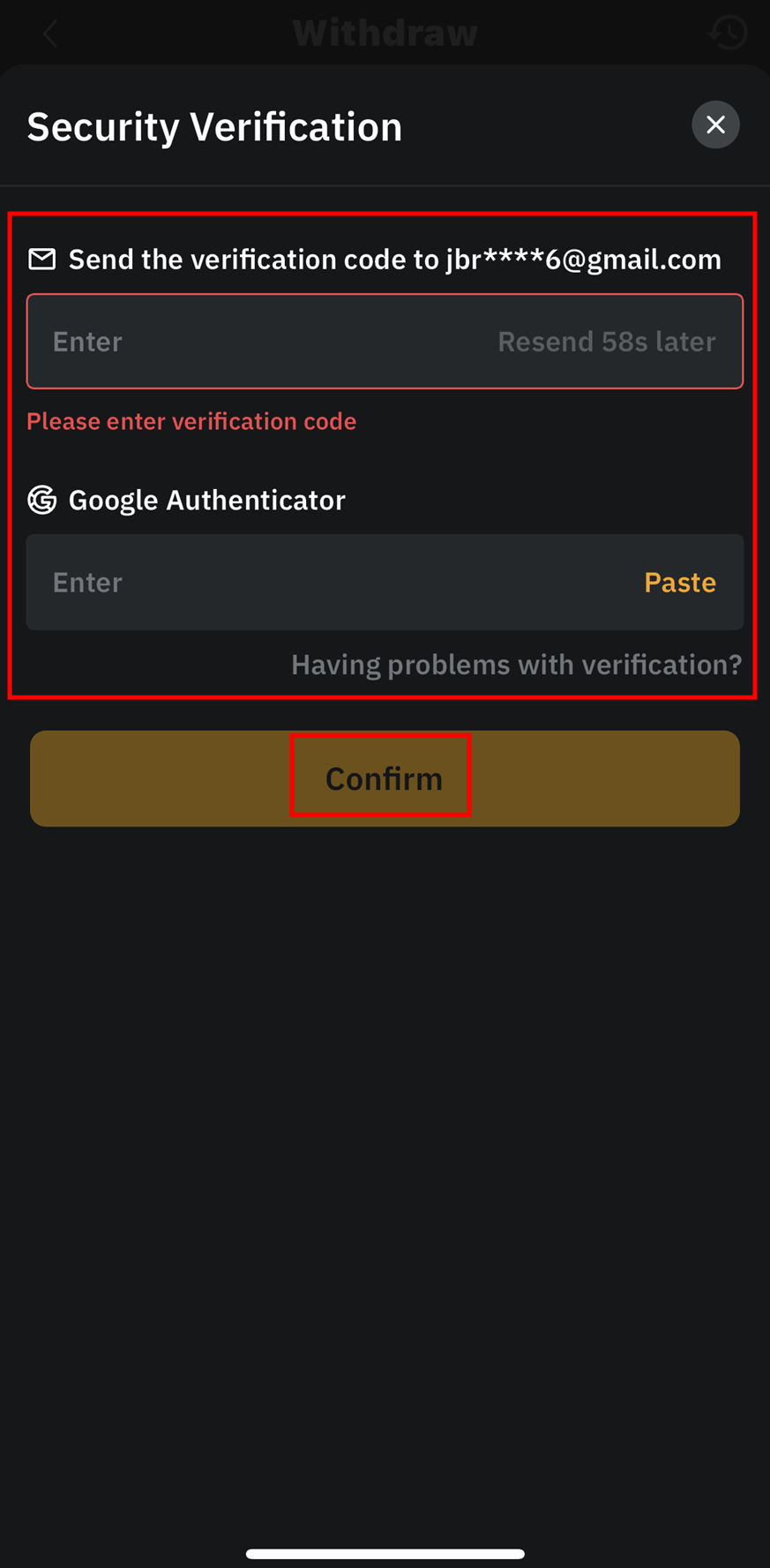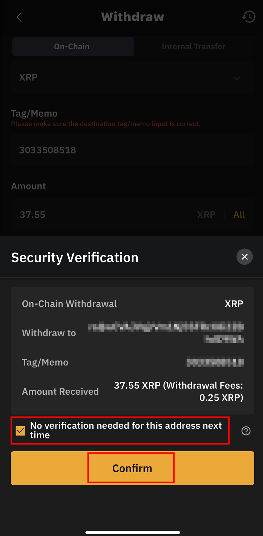 8. 최종적으로 주소와 데스티네이션태그 수량을 확인 후 동의사항 체크 후 Confirm을 클릭하면 추가보안인증을 해야한다.