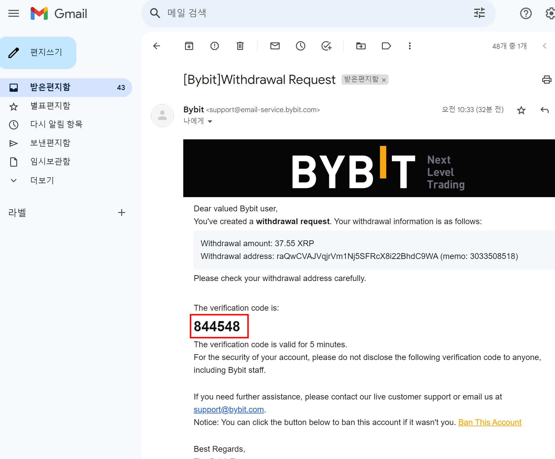 9. 이메일로 온 인증코드 6자리와 OTP 인증코드 6자리를 각각 입력하면 출금 신청이 완료된다.