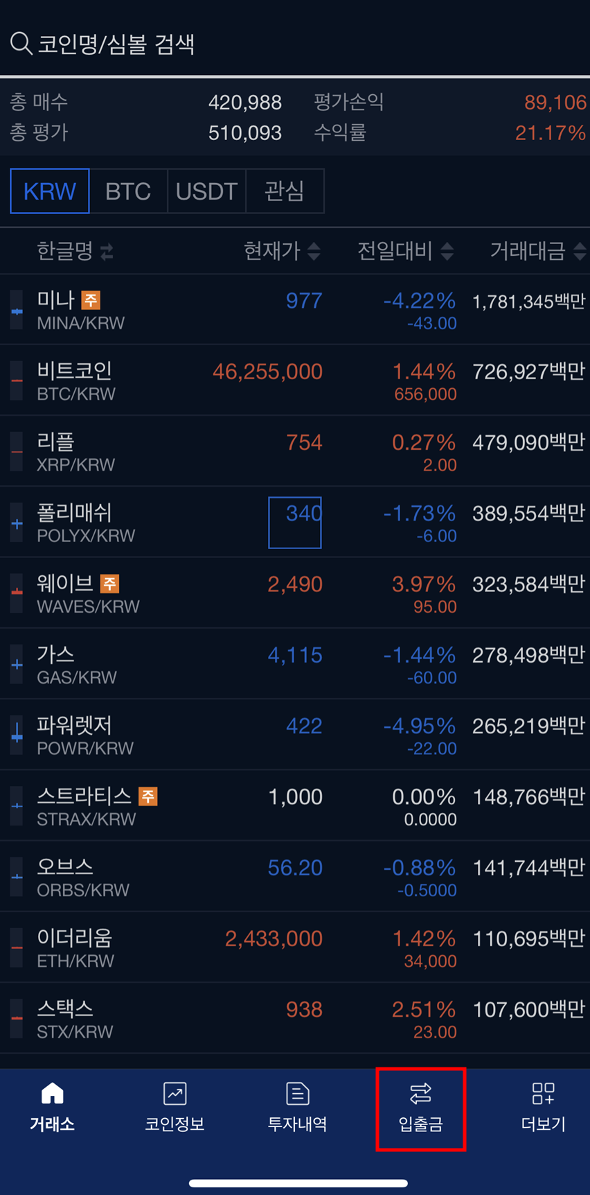 5. 업비트 앱에 로그인 후 하단 메뉴에서 입출금을 클릭한다.