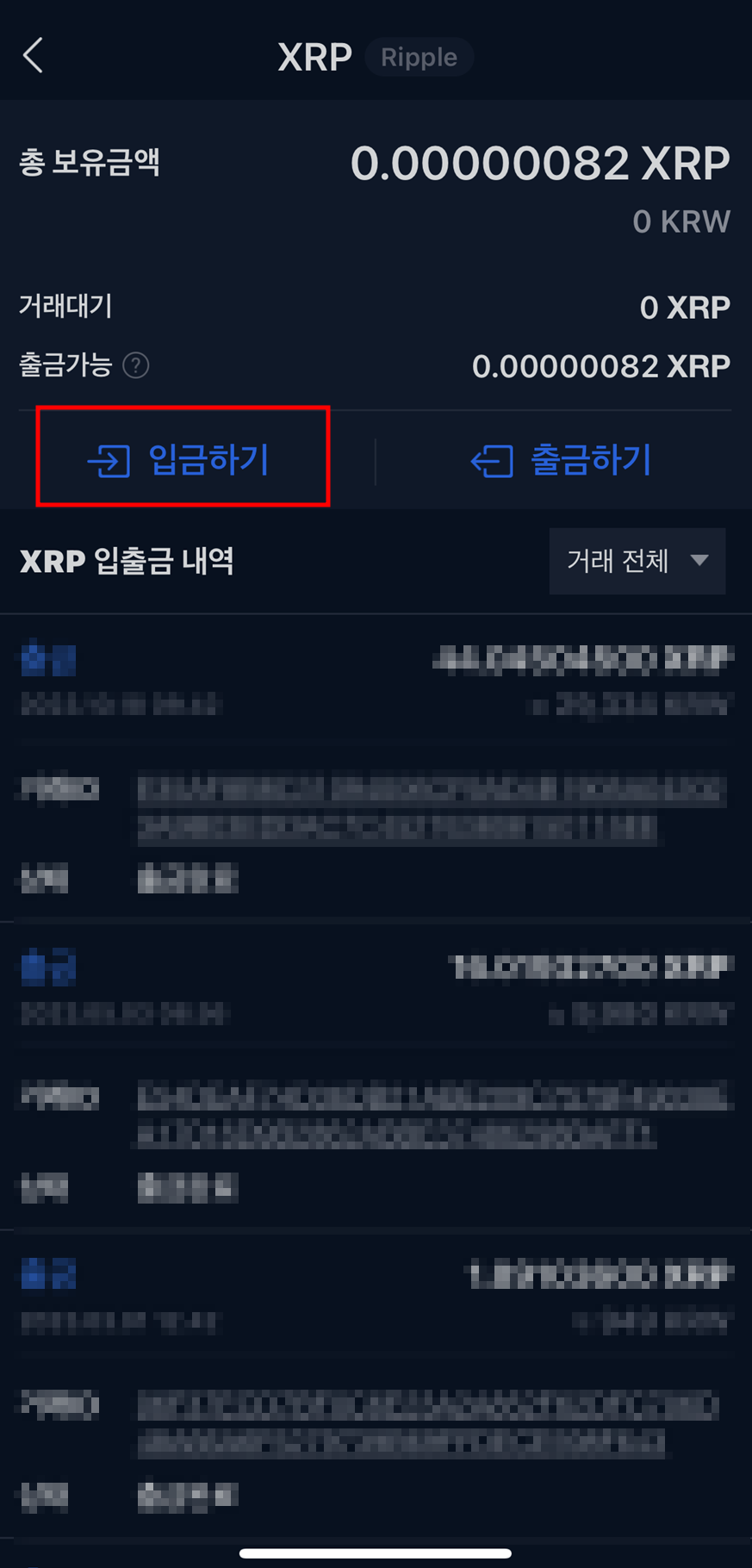 6. 보유코인목록에서 리플을 선택하면 오른쪽 화면과 같은 창이 나타나는데 여기서 입금하기를 선택한다.
