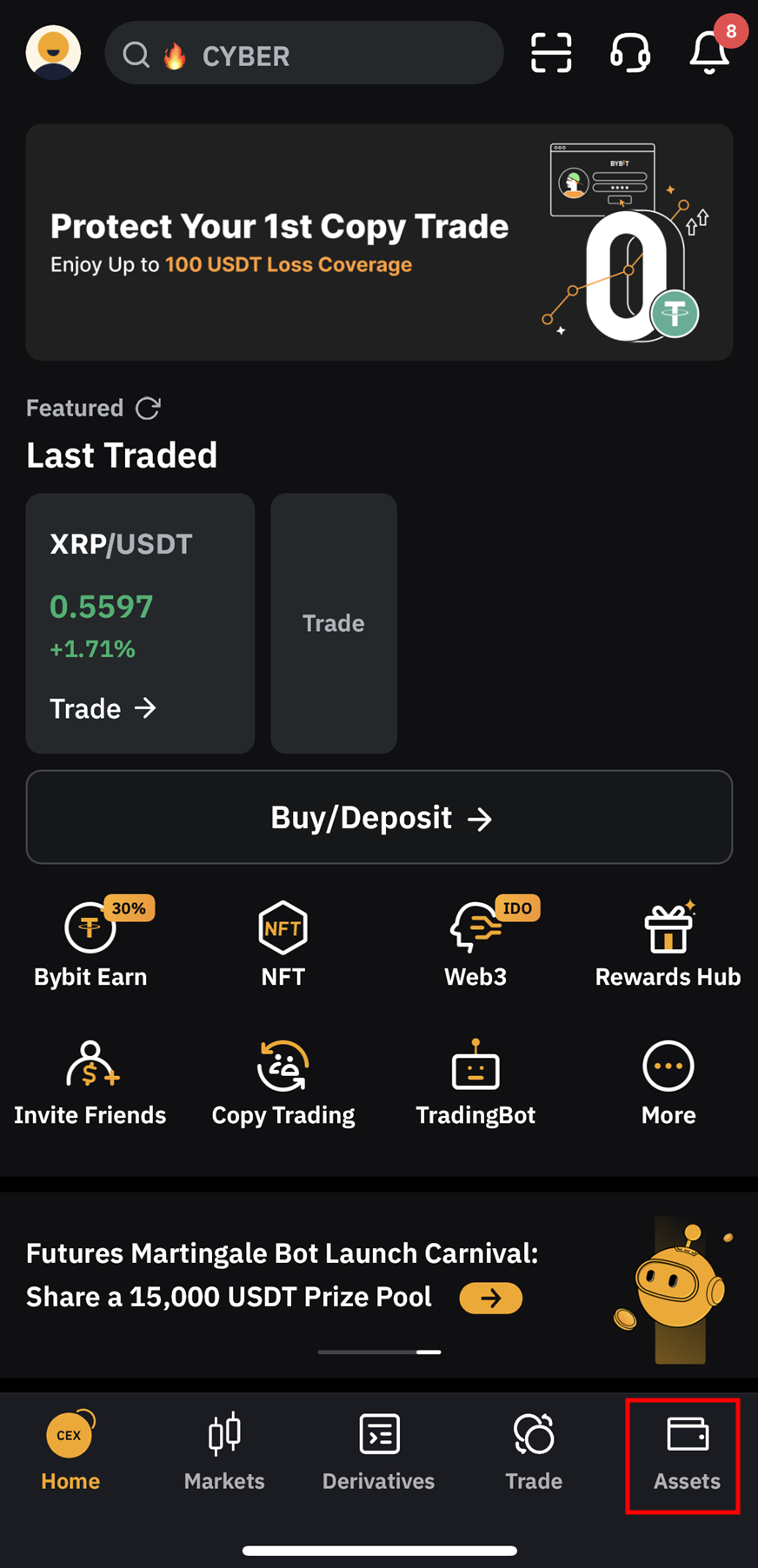 1. 바이비트 앱 로그인 후 우측 하단의 Assets를 클릭한다.