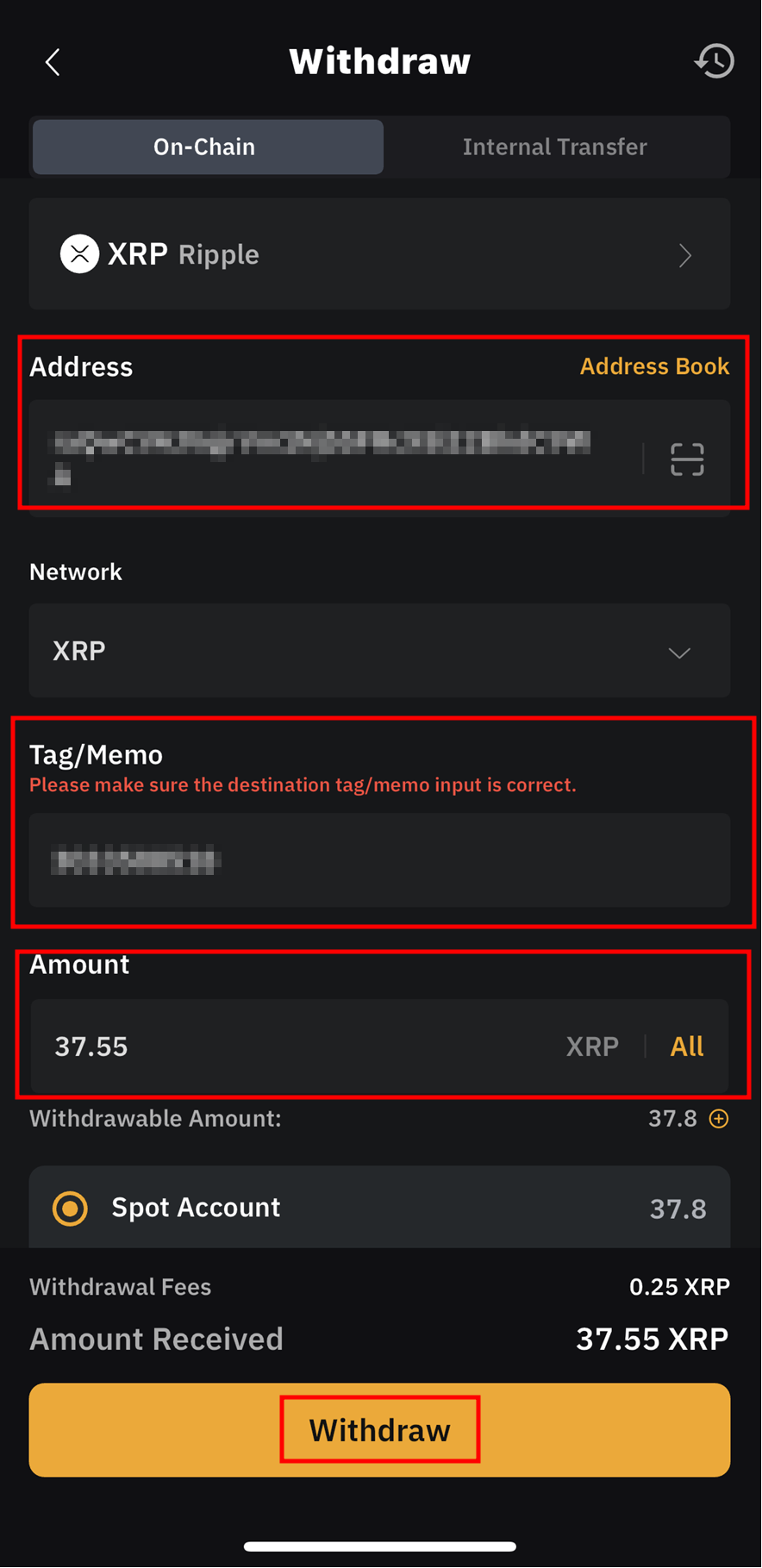 4. 코인은 XRP로 되어있는지 확인하고 Address(주소)와 Tag/Memo(데스티네이션 태그)에 빈칸으로 되어있다. 여기까지 멈춰놓고 업비트앱을 실행하여 리플의 주소와 데스티네이션태그를 복사해온다.