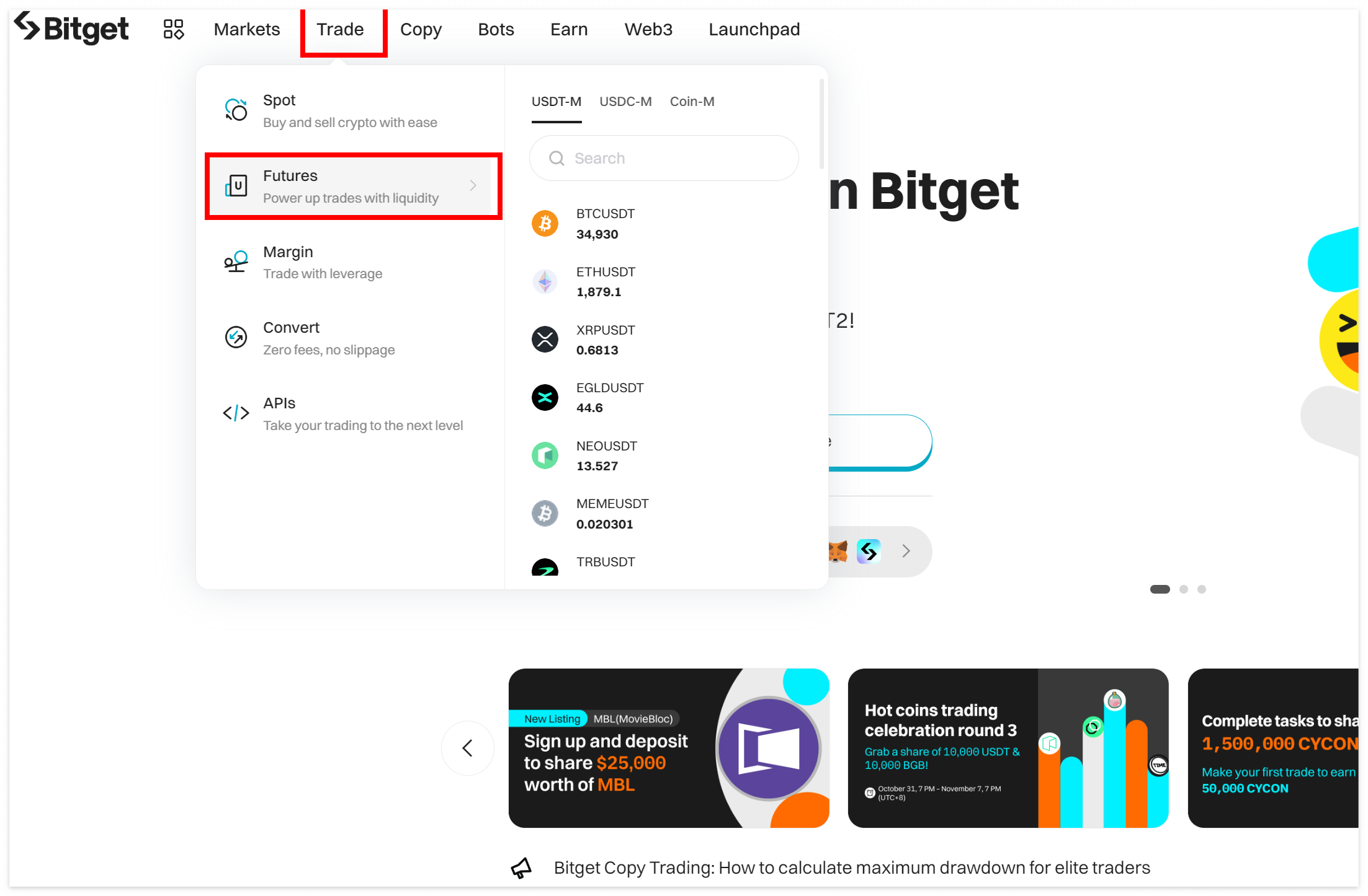 비트겟 거래소에서 Trade를 클릭하고 Futures를 선택하면 선물거래 화면으로 이동한다.