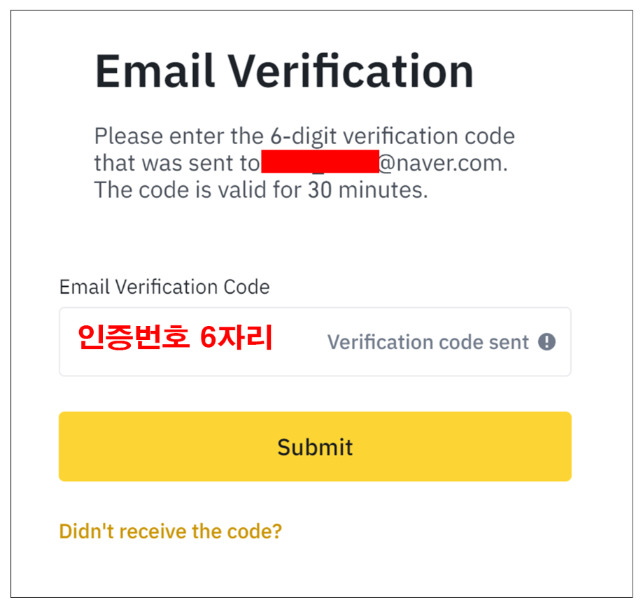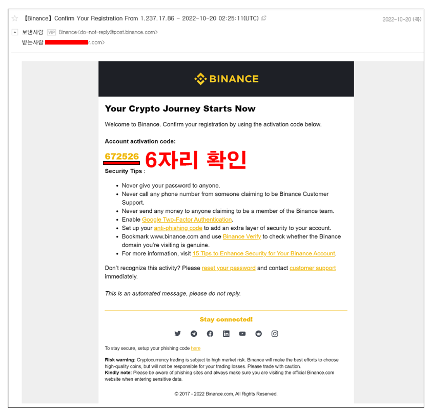 예시는 이메일로 진행하였고 메일함에 바이낸스에서 보낸 메일이 도착해있다. 숫자 6자리를 확인 후 그대로 입력한다.