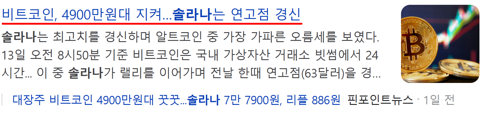 비트코인이 4900만원대를 지키고 솔라나는 최고치를 경신하면서 알트코인 중 가장 가파른 오름세를 보였다고 한다.