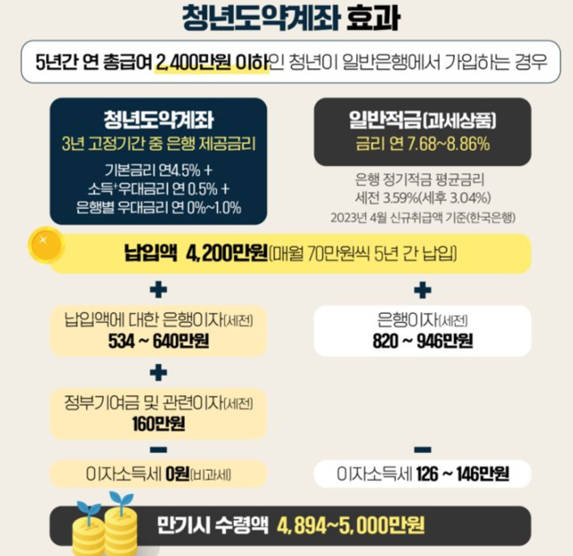 일반은행과 청년도약계좌를 비교한 표는 위와 같다. 납입액 4,200만원(매월 70만원씩 5년간 납입)할 경우 두 상품의 차이가 상당하다.
