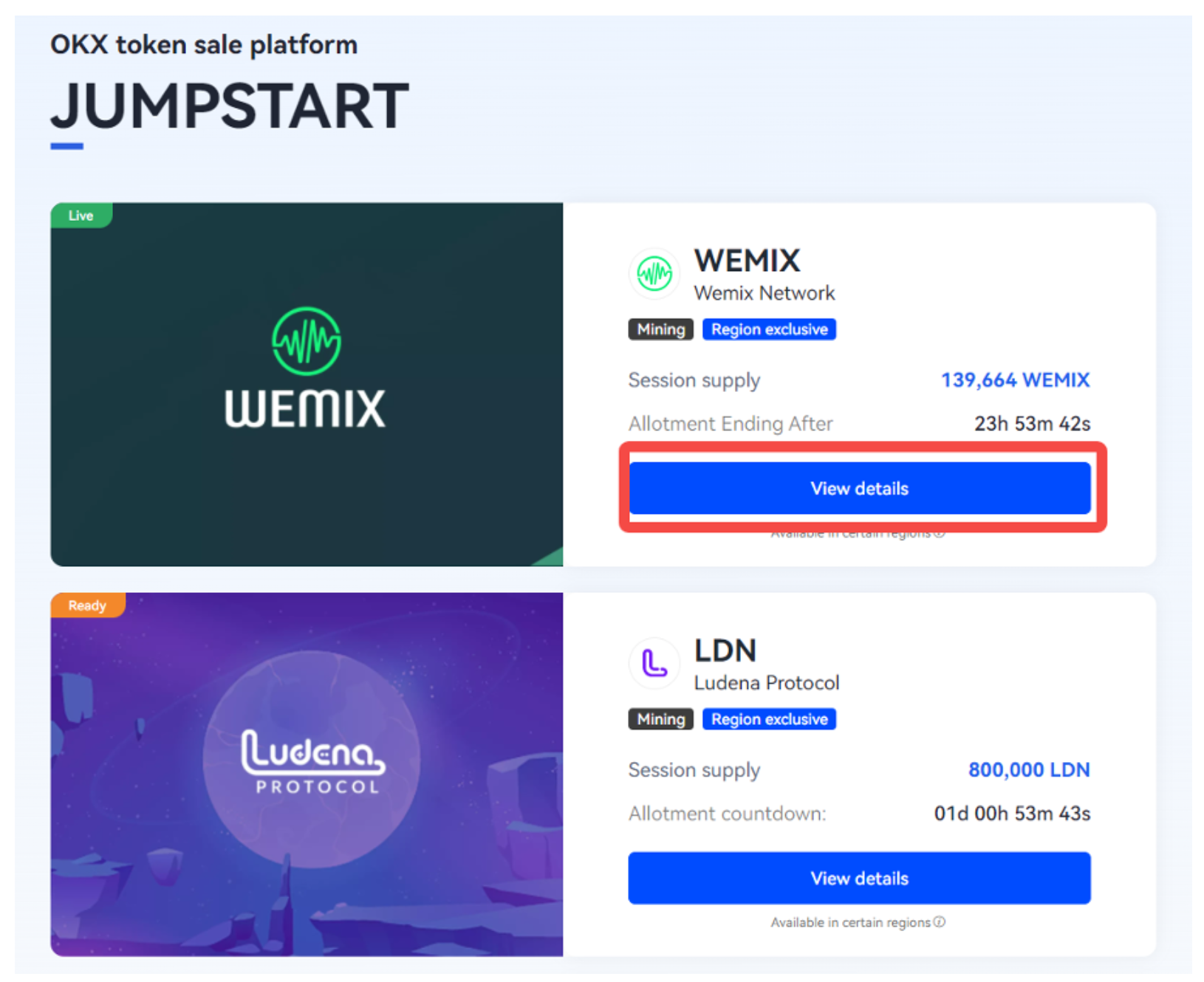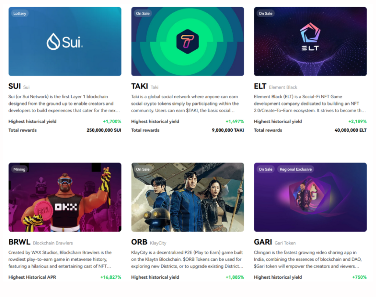 점프스타트를 통해 채굴 가능했던 코인 목록이다. 오케이엑스 자체 코인인 OKB코인을 일정 기간 예치하고 다른 코인으로 보상을 받는다.