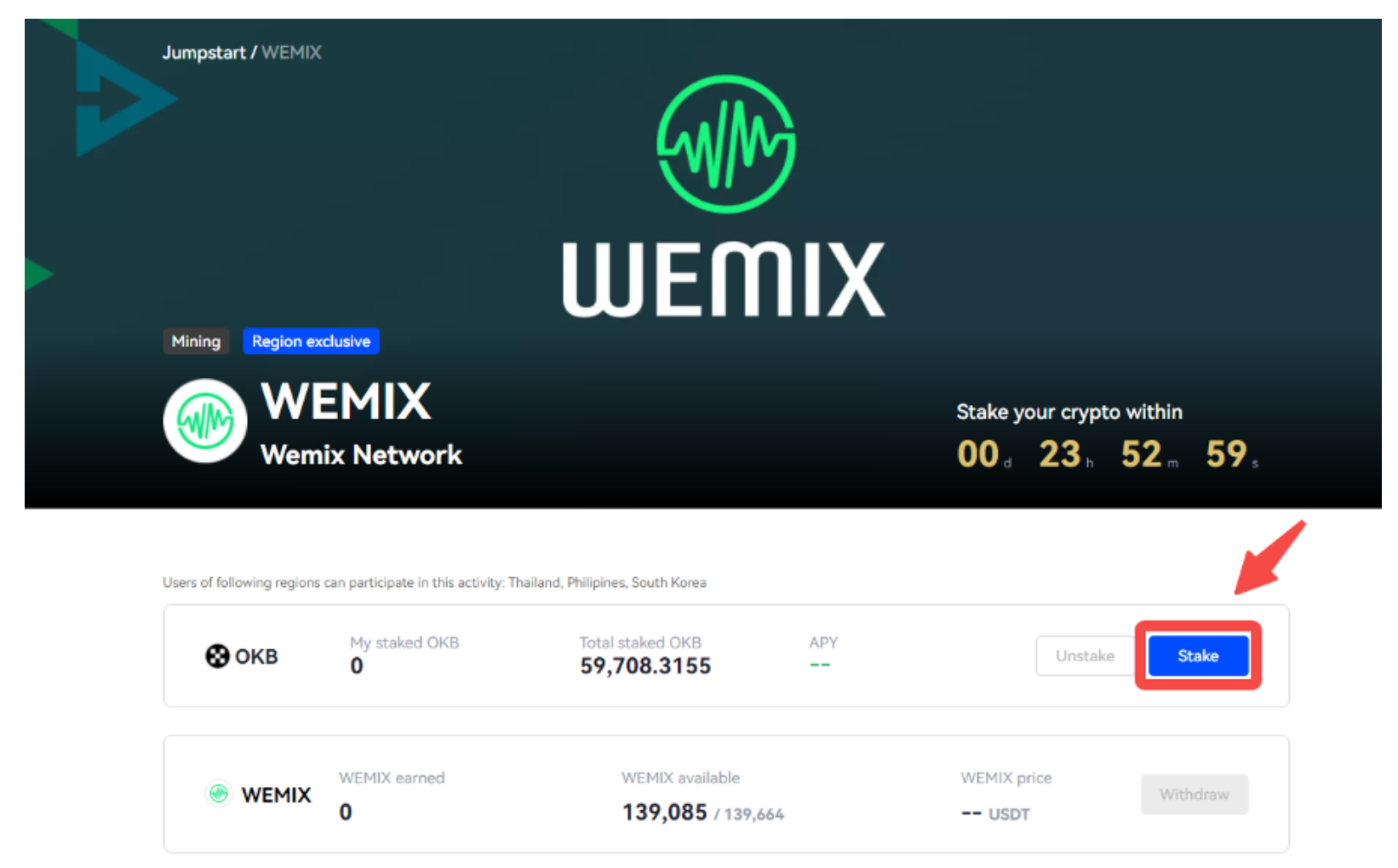 위믹스 점프스타트 랜딩 페이지로 이동되며 시작까지의 시간,현재 스테이킹 되어있는 OKB수량등 자세한 내용을 알수 있다. 위믹스 점프스타트를 참여하려면 Stake(스테이크)를 클릭한다.