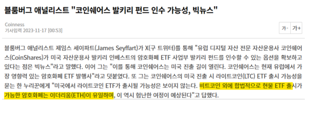 블룸버그발 소식으로 신뢰도가 굉장히 높다. 비트코인 ETF 결과 후 진행될 것으로 예측했지만 블랙록에서는 이미 이더리움 현물 기반 ETF 신청서를 제출했다고 한다.