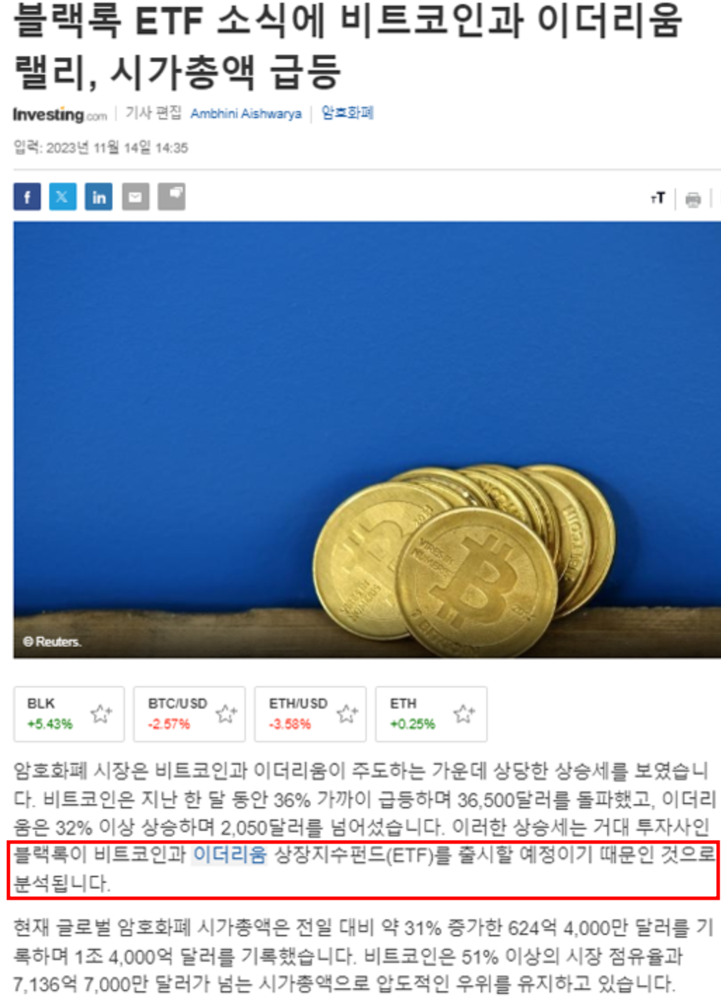 블랙록 이더리움 현물 ETF 출시 소식에 급등을 하였다. 블랙록이 비트코인 현물 ETF와 이더리움을 출시할 예정이기 때문이다. 이 소식에 이더리움은 곧바로 10% 상승하며 민감하게 반응하였으며 비트코인에 버금가는 가치를 가진 암호 화폐임을 증명한 것이다.