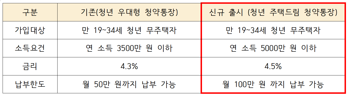 청년 주택드림 청약통장은 기존의 청년 우대형 주택청약 종합저축(청년 우대형 청약통장)을 확대 개편한 것으로 기존 통장에 비해 가입 요건과 이자율, 납입한도 증이 개정되었다.