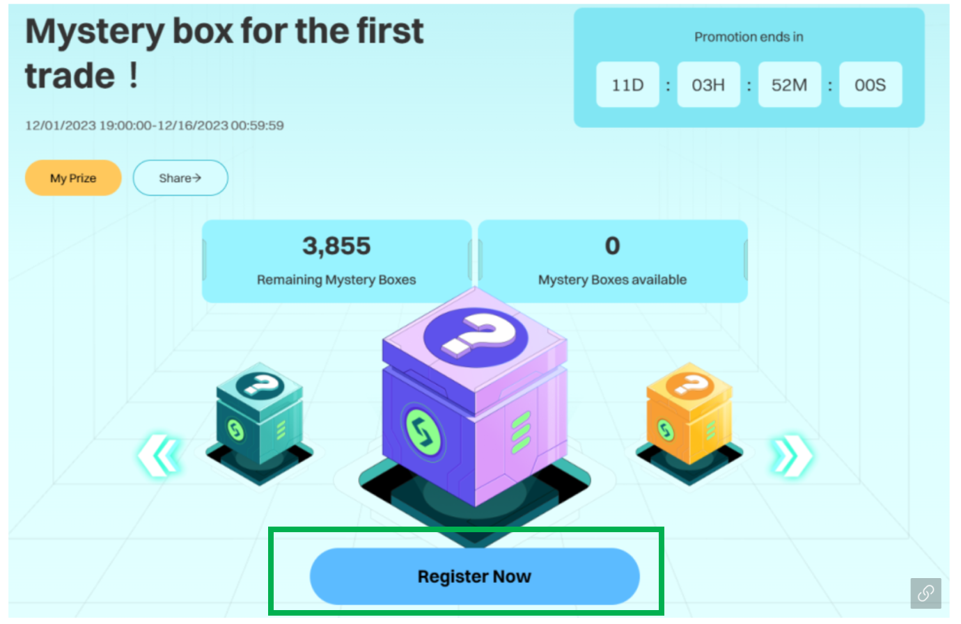 회원가입 후 KYC 인증까지 진행한 후에 첫 가입 회원은 이벤트 페이지에서 위에 표시한 Register Now 버튼을 누르면 이벤트 참여가 된다.