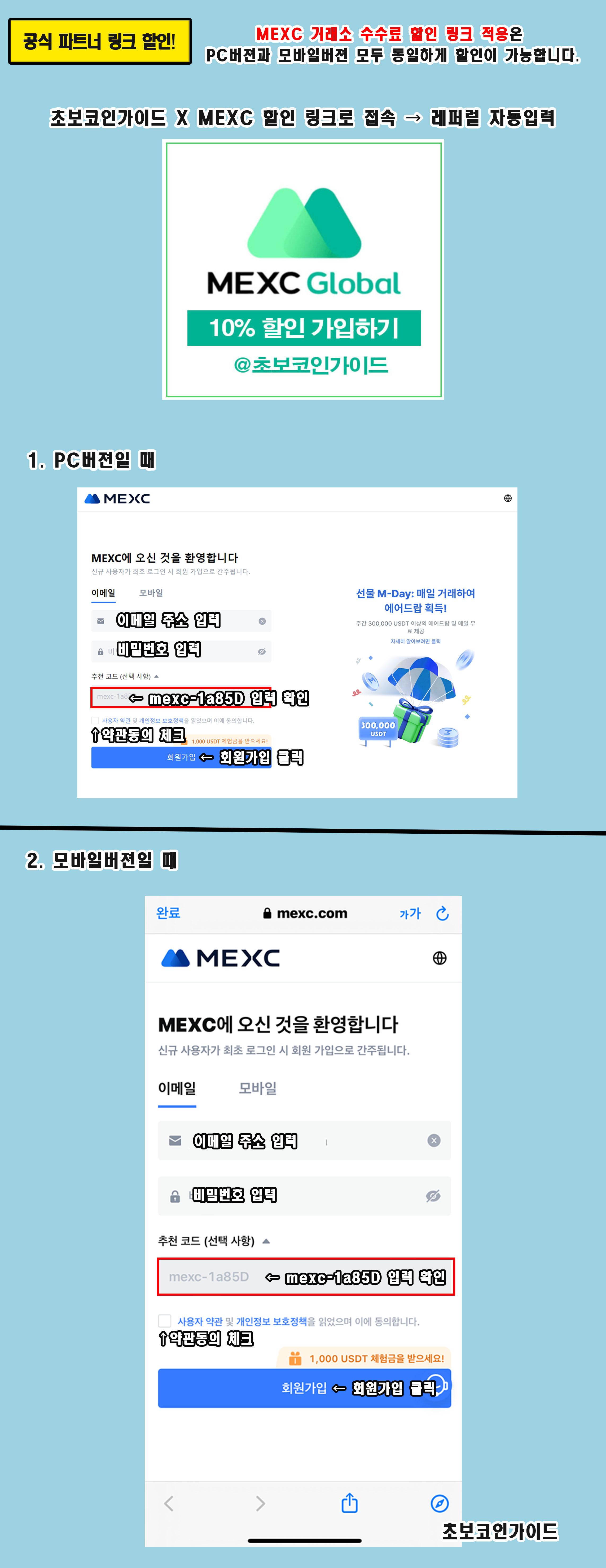 초보코인가이드 공식 레퍼럴 링크를 클릭하여 접속하면 PC버젼과 모바일버젼 동일하게 자동으로 할인 레퍼럴 코드인 mexc-1a85D가 자동으로 입력되어 있으므로 수수료 할인 받기를 원한다면 링크를 통해 접속 후 가입하는 것을 추천합니다.