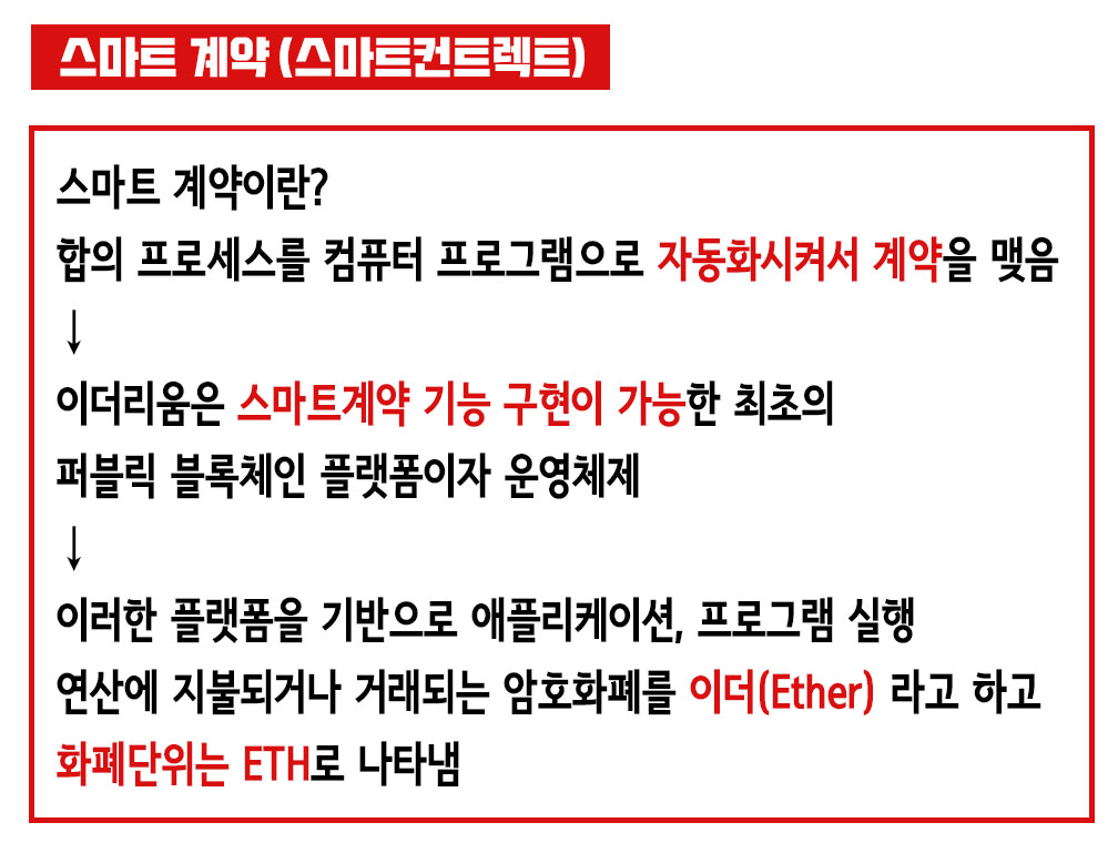 스마트계약은 합의 프로세스를 컴퓨터 프로그램으로 자동화시켜서 계약을 맺고 이더리움은 스마트 계약 기능 구현이 가능한 최초의 퍼블릭 블록체인 플랫폼이자 운영체제이다. 이러한 이더리움 플랫폼을 기반으로 애플리케이션, 프로그램 실행 연산에 지불되거나 거래되는 암호화폐를 '이더(Ether)'이라고 하고 화폐단위는'ETH'로 나타낸다.