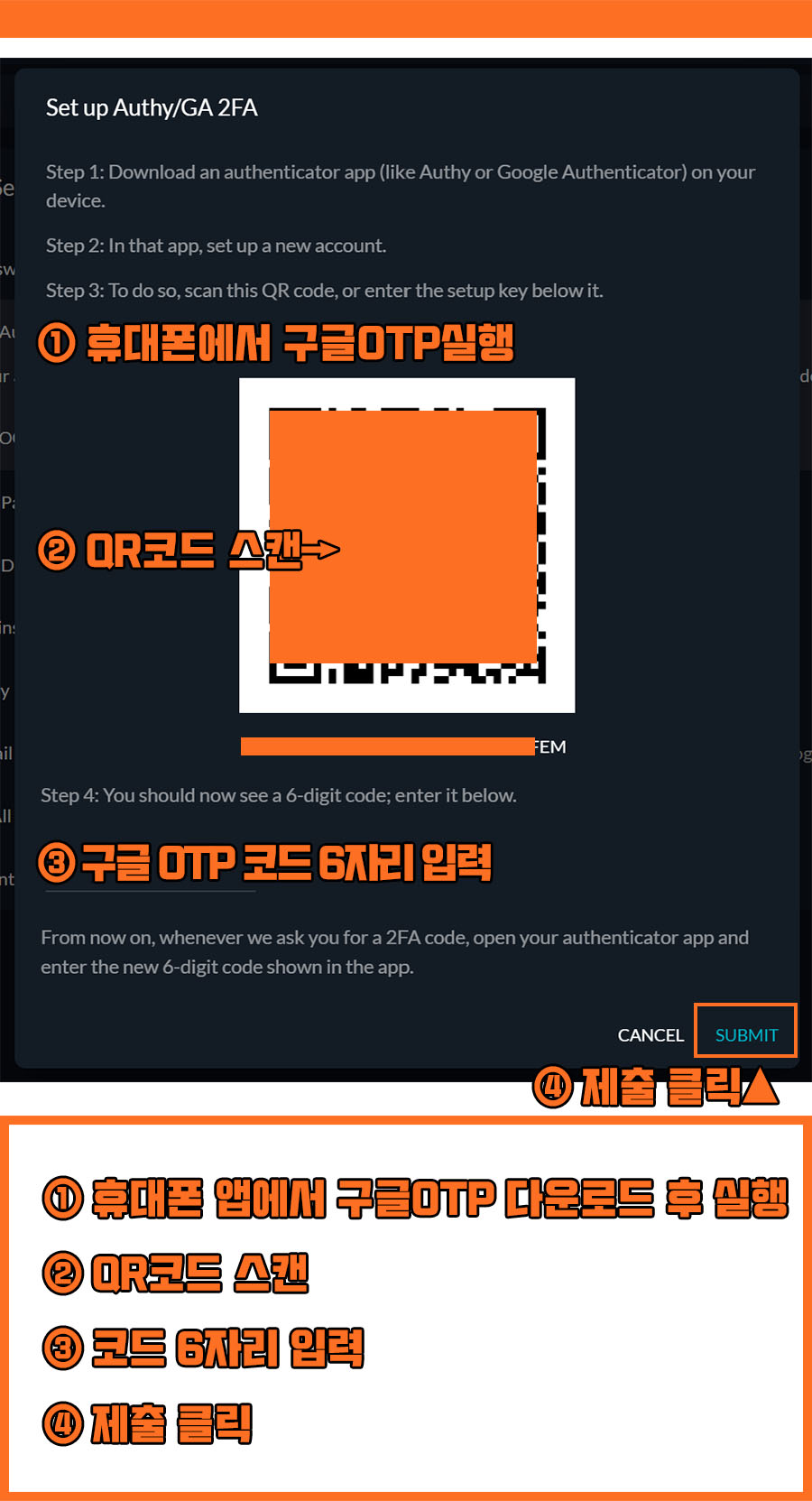 • 이중인증(2FA) → 구글OTP = 여러 거래소와 어플을 사용하기때문에 구글OTP에서 한번에 컨트롤하는 것을 추천함