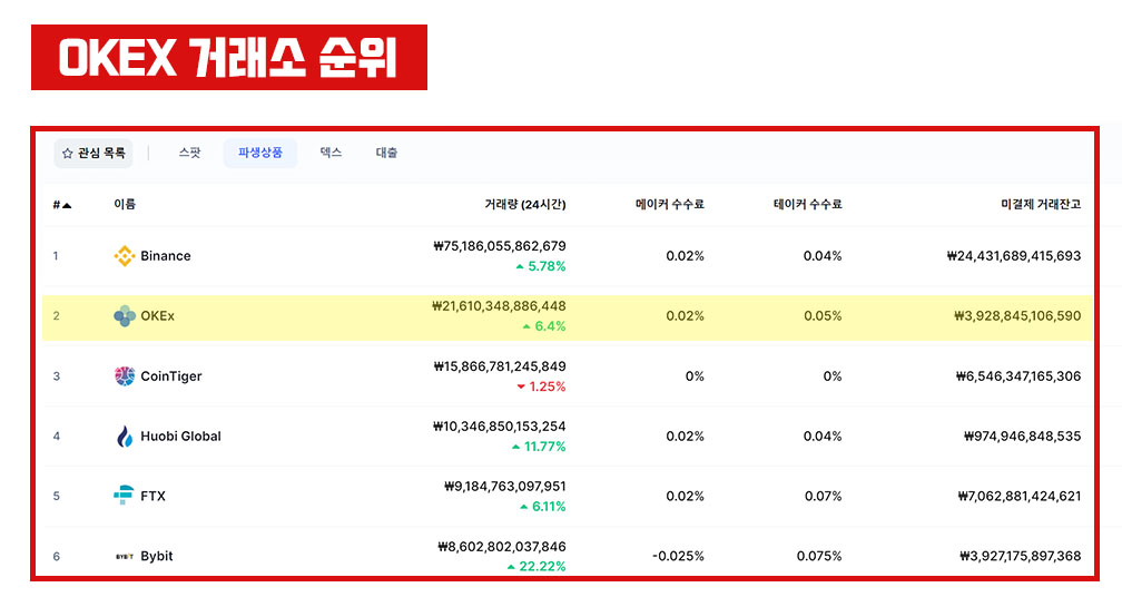 우리나라에서 바이비트와 바이낸스가 마케팅이 많은 힘을 쏟아보은 덕으로 코인마켓캡 현재 기준 OKEX는 암호화폐 선물거래소 2위임에도 불구하고 생소한 분들이 많을 것이다.