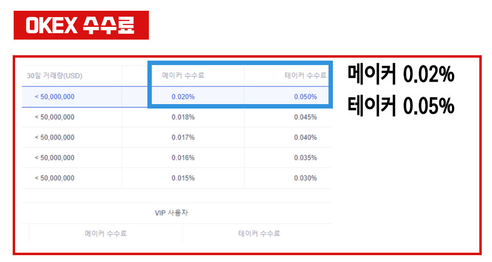 메이커 0.02%, 테이커 0.05%로 저렴한 편이고 거래량이 늘어나거나 자체 발행 토큰인 OKB를 보유하면 수수료를 할인해준다.