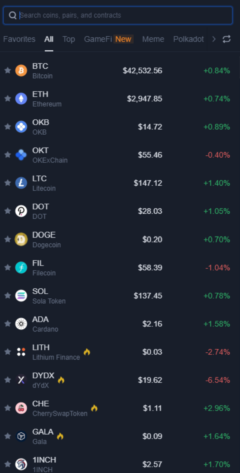 대형 거래소답게 주요한 코인들은 대부분 상장되어있다. 현물/선물 모두 지원하고 자체 Cefi상품도 취급한다.
