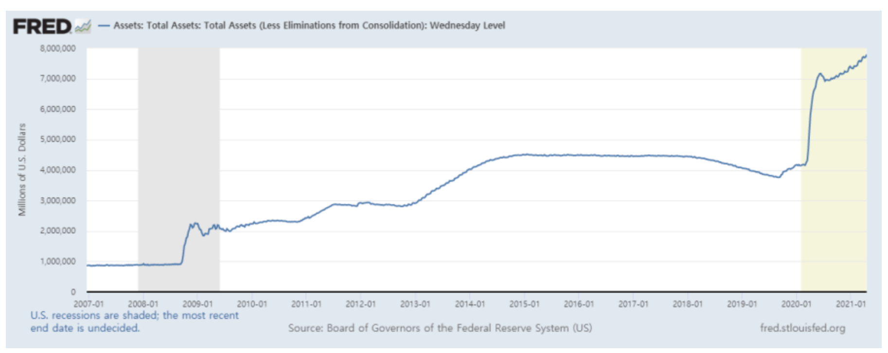 위 그래프를 보면 미국이 이번 코로나19로 인해 뿌린 돈이 2008년 서브프라임때와 비교했을 때 어마무시하다. 우리나라도 마찬가지고 전 세계가 인플레이션인 것이다. 이러한 인플레이션 시대에 화폐의 가치는 떨어지고 자산의 가치는 올라가고 이러한 상황에서 부(富)는 대출받는 사람에게 이전되니 대출을 잔뜩 받은 정부에 나의 돈이 넘어가게 되는 현상이 나타나게 된다.