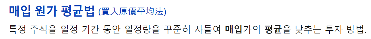 사전적의미로 특정 주식을 일정 기간 동안 일정량을 꾸준이 사들여 매입가의 평균을 낮추는 투자 방법이라 말한다.