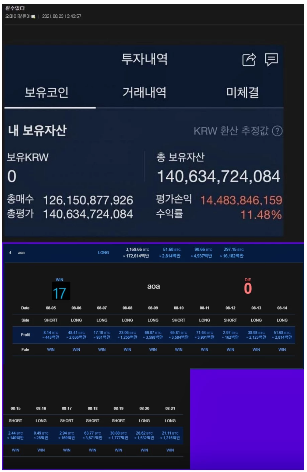 워뇨띠는 업비트, 바이낸스, 비트맥스에 투자한 내역 및 수익률을 공개하였고 업비트에서 1400여억원, 바이낸스에서 500여억원, 비트맥스에서 1000여억원 등이 있다고 전했다.