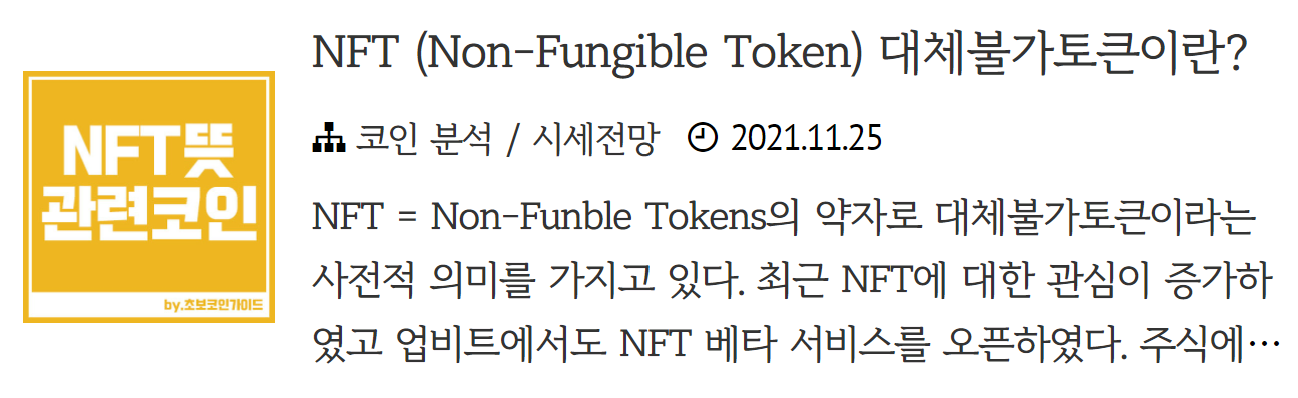 NFT는 Non-Fungible Token의 약자로 대체불가토큰이라고 한다. 하나의 토큰을 다른 토큰으로 대체하는 것이 불가능한 암호화폐이다.